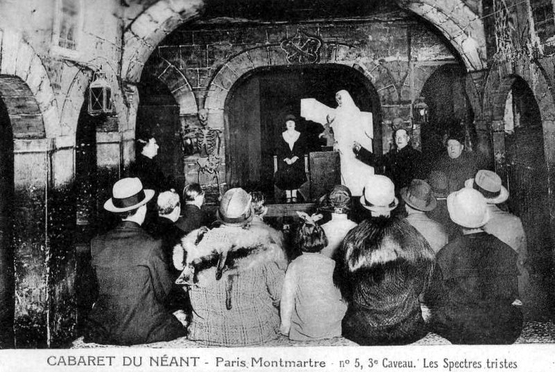 Despite the scarcity of visual archive material featuring the cabarets, judging by literary accounts providing first-hand snap shots of nightlife in Paris, it’s hardly surprising that the Cabaret du Néant was found to be more disturbing. It seems to have embodied a visceral approach with painful reminders of mortality whilst focusing on the actual process and ritual of death in a way that made people face a primal fear. Moreover, some aspects of it created an uncanny experience, which would automatically involve the elements of emotional shock and repulsion. Besides the uncanny acts from the room of disintegration, there were other elements that were subtly frightening, nihilistic, and potentially psychologically scarring for some, as the cabaret of the void focused on conveying the emptiness of existence in a surreal way that had the effects of psychological horror.
